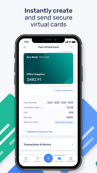 يسمح التطبيق للمستخدمين بتحديد حدود الإنفاق وتواريخ النشاط وغيرها لكل بطاقة افتراضية. يضمن هذا المستوى من التحكم إدارة النفقات بفعالية وفقًا لسياسات الشركة. بالإضافة إلى ذلك، يمكن للمستخدمين إنشاء بطاقات مختلفة لنفقات مختلفة، مما يجعل تتبع الإنفاق أسهل وتصنيفه.